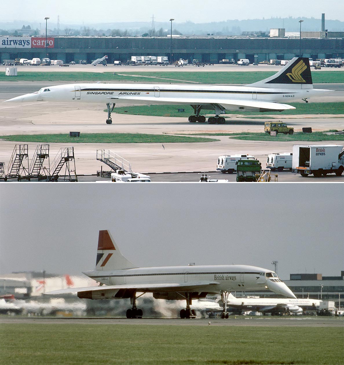 Part of the agreement between Singapore Airlines and British Airways was to operate the Concorde, registered G-BOAD (also temporarily G-N94AD), in a dual livery with Singapore Airlines titles on the left and British Airways colours on the right of the aircraft.