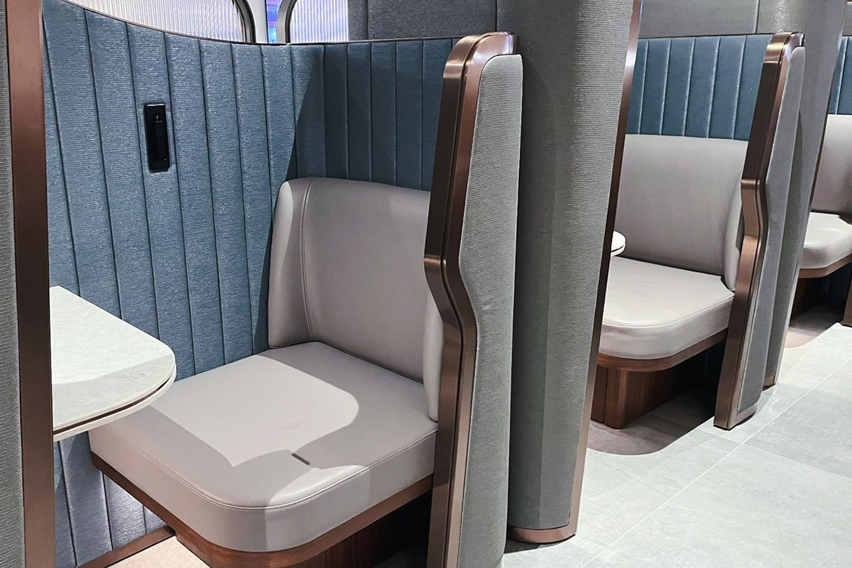 We’re a big fan of the modular seats – these semi-private alcove-style arrangements allow solo travellers to sit in comfort or couples to sit side-by-side and spread out a little, ideal for longer stays.