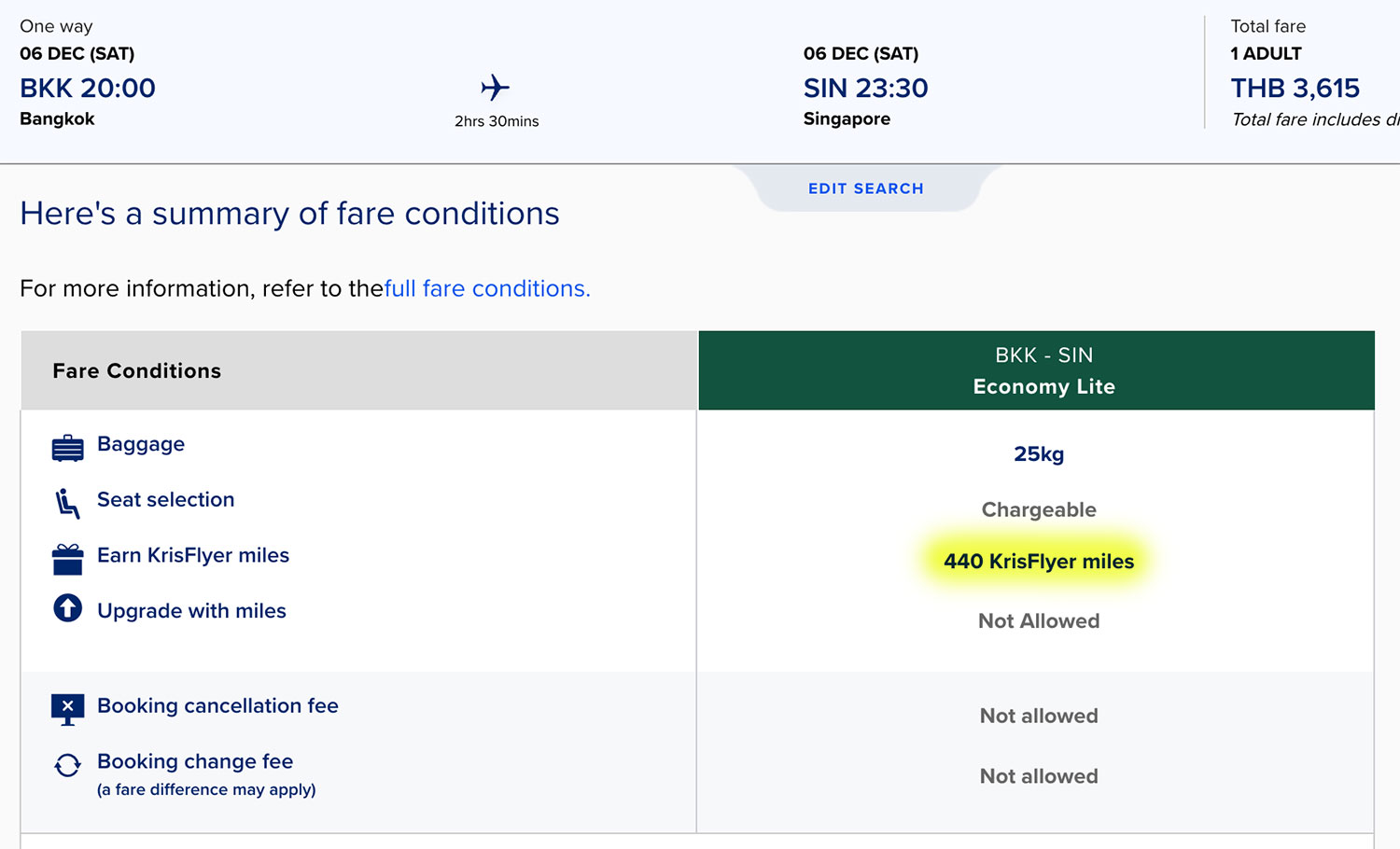 That THB 3,615 Singapore Airlines ticket would earn me 440 KrisFlyer miles, even booking the Economy Lite fare. This is often overlooked – but especially on short routes, forgone miles can easily knock 10-15% off your true redemption valuation.