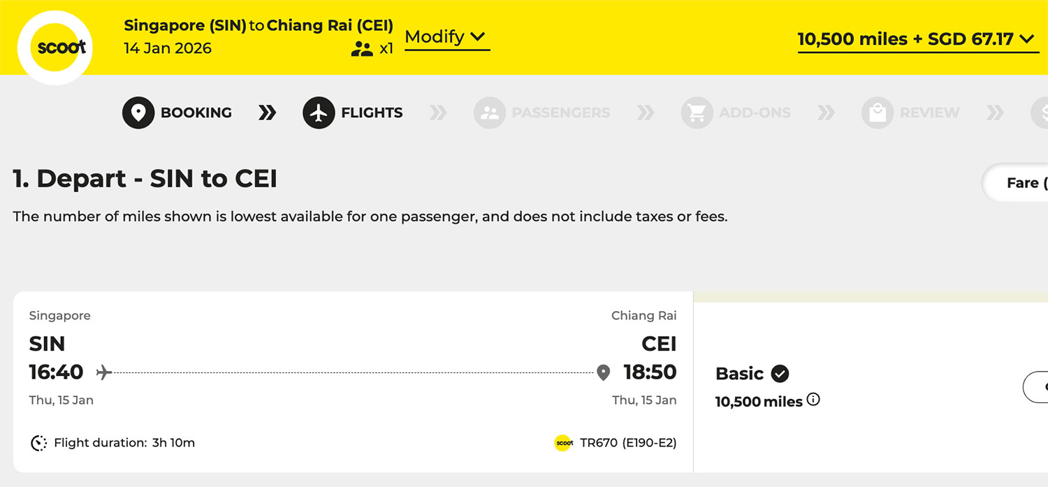 | Scoot award cost | 2,500 KrisFlyer miles + THB 1,725.25 |
