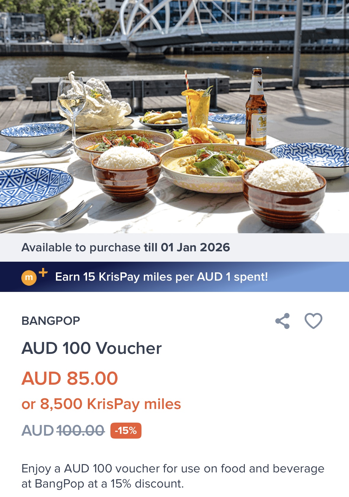 In this example you can get 15% off a voucher for AU$100 off the bill at BangPop in Melbourne, earning 15 mpd for the AU$85.00 payment (1,275 miles), then redeem the voucher right through till mid-2026 (within 12 months of purchase).