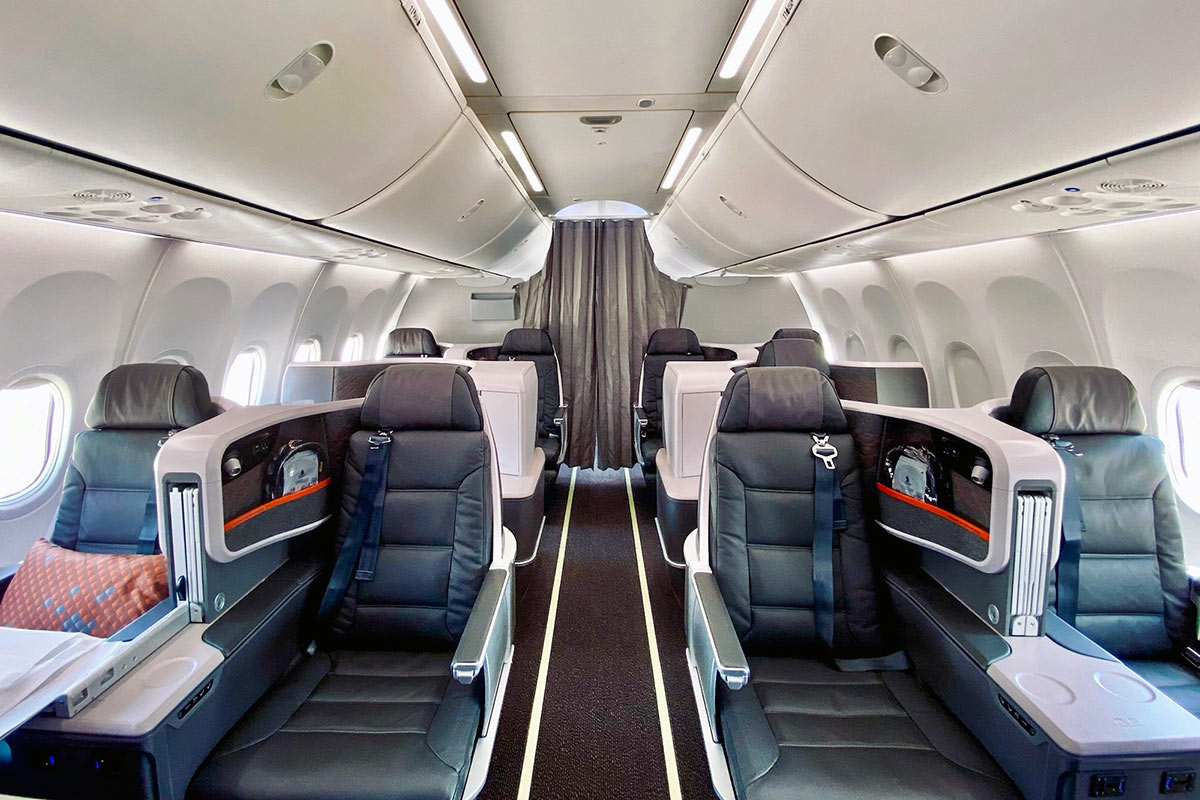 Optimised for 1 to 5 hour regional flights, it has 10 seats in an alternating 2-2 / 1-1 / 2-2 layout, and of course it now goes without saying – these seats go fully flat!