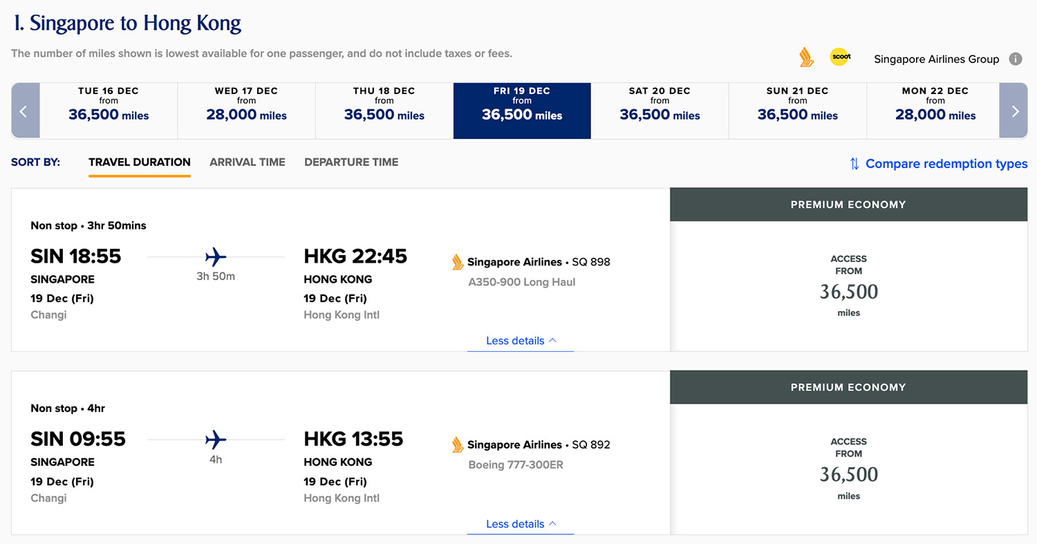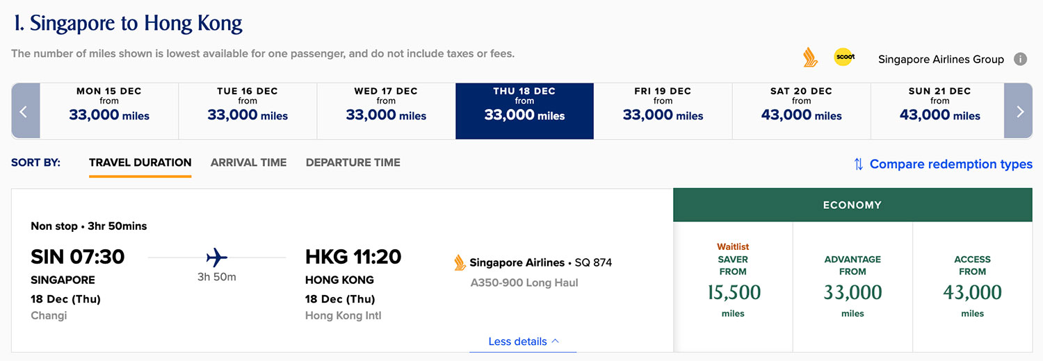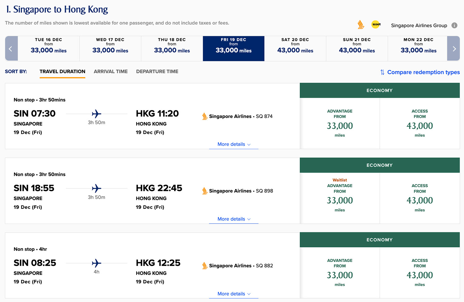 For example, between Singapore and Hong Kong during peak travel periods many dates only have Economy Advantage award space available on SIA, at 33,000 KrisFlyer miles one-way.