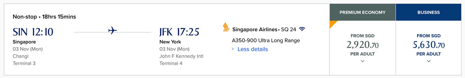 It’s 9am, and the fastest route, SQ24, Singapore Airlines’ nonstop to JFK, wheels up at 12.10pm – just three hours from now.