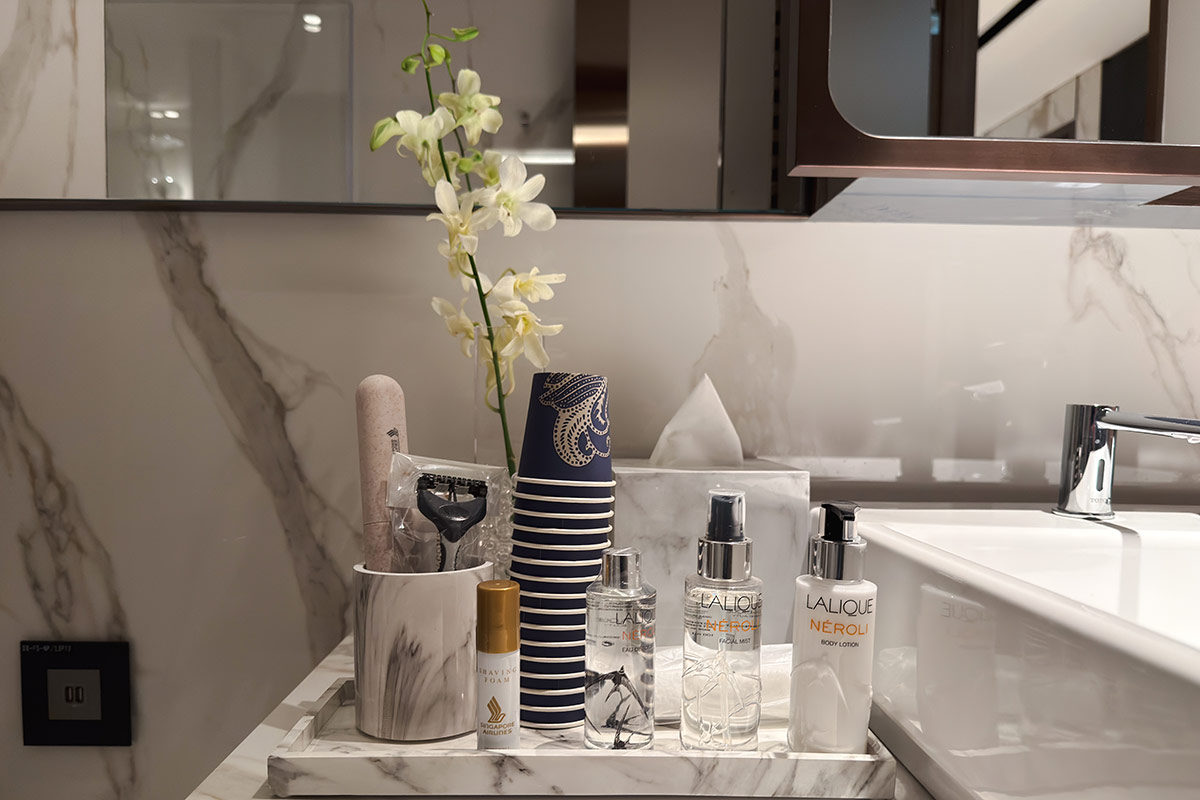 Each suite is stocked with Lalique Neroli products, including body lotion, facial mist, and eau de toilette, alongside shampoo and shower gels, though the latter are sadly still unbranded which does feel ‘cheap’ for a First Class lounge.