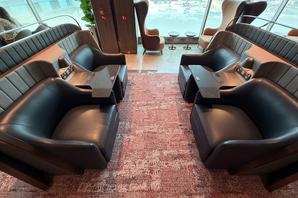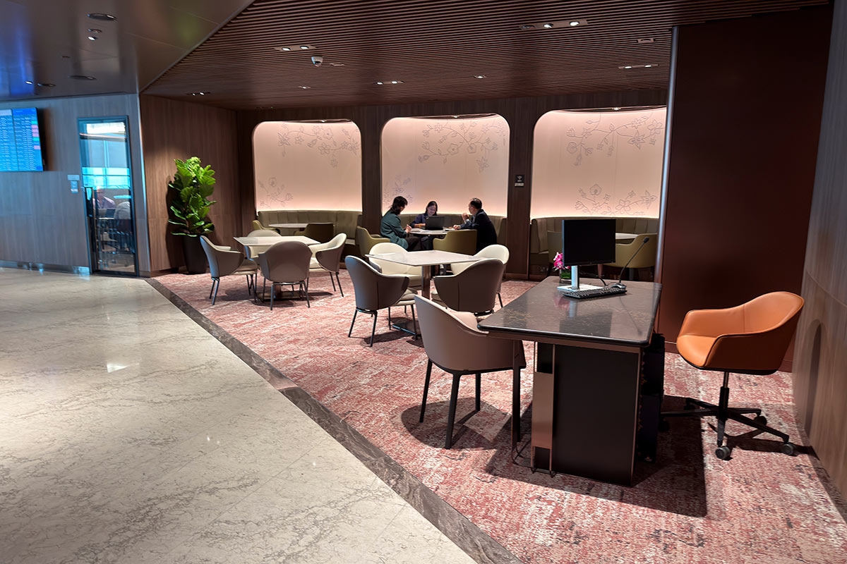 When you first enter the lounge, a mixed-use space on the right side offers some seating options including booth-style tables for four with SIA’s signature batik motif sculpted into the alcove behind.