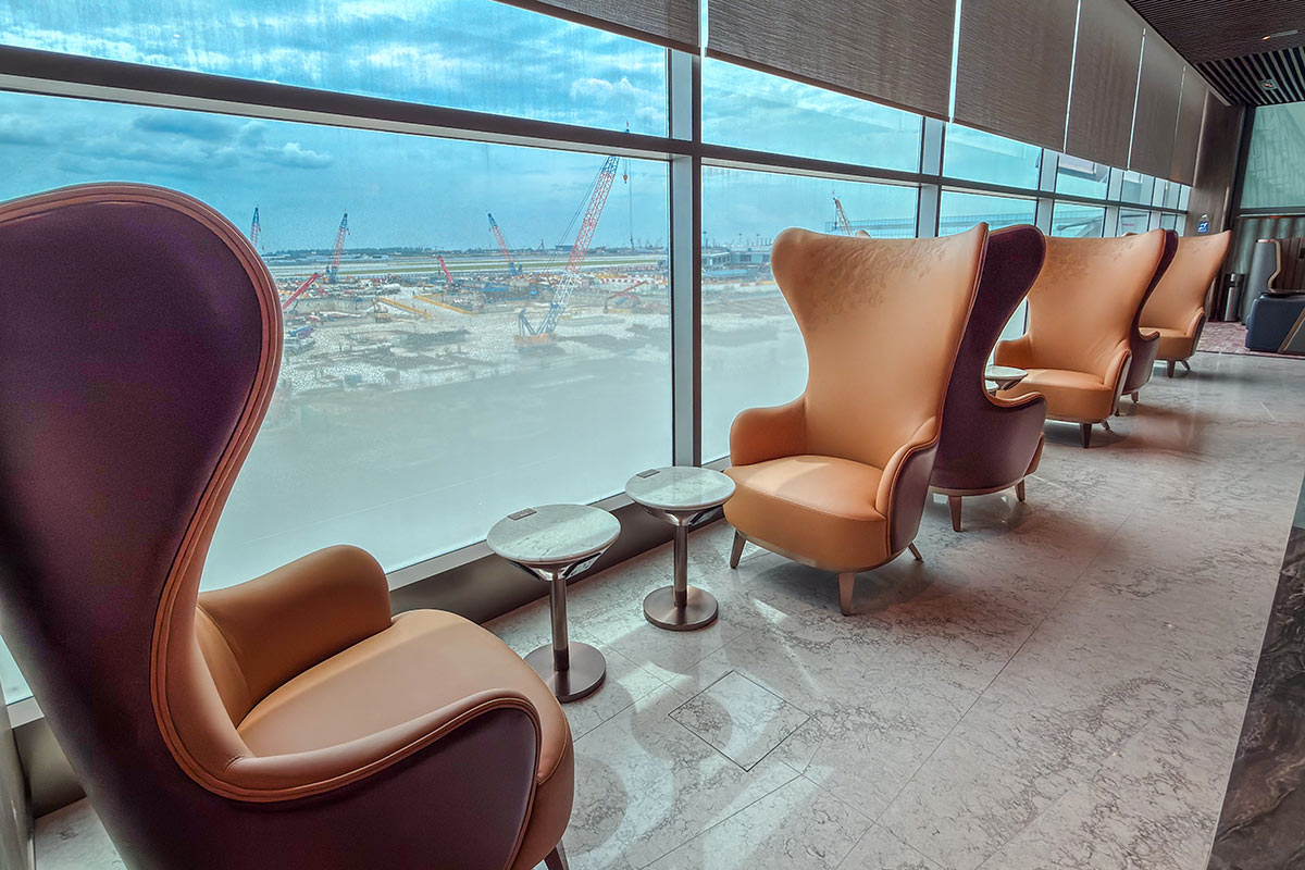 The popular wingback chairs, six in total, are a go-to with full-height window views, which will progressively upgrade from ‘construction site’ to aircraft parking area over the next year or so!