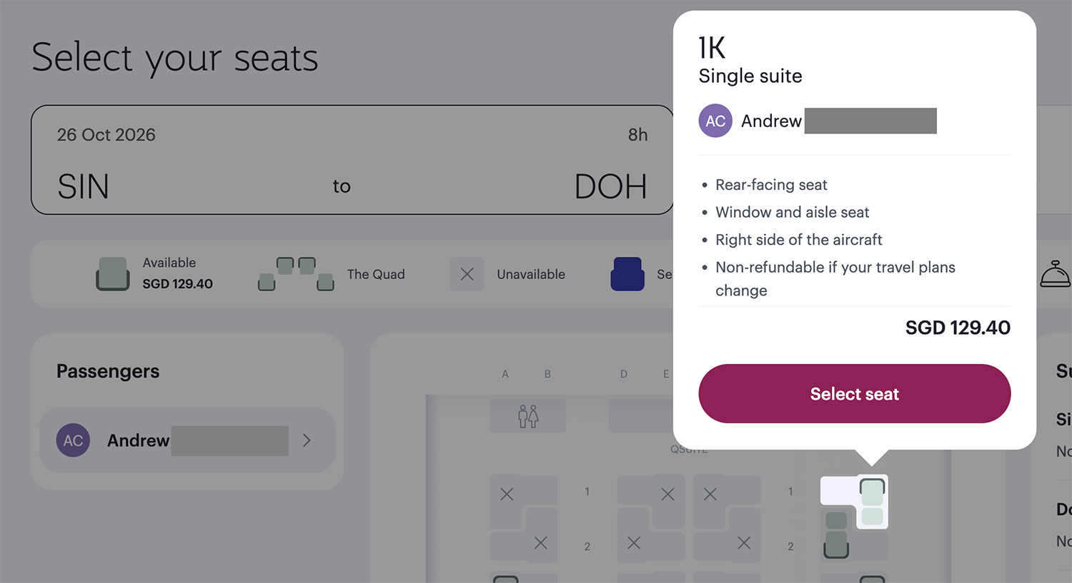As a solo traveller on a Qsuite-equipped aircraft, I honestly wouldn’t mind skipping seat selection and taking my chances. Every seat in the solo configuration offers excellent privacy anyway.