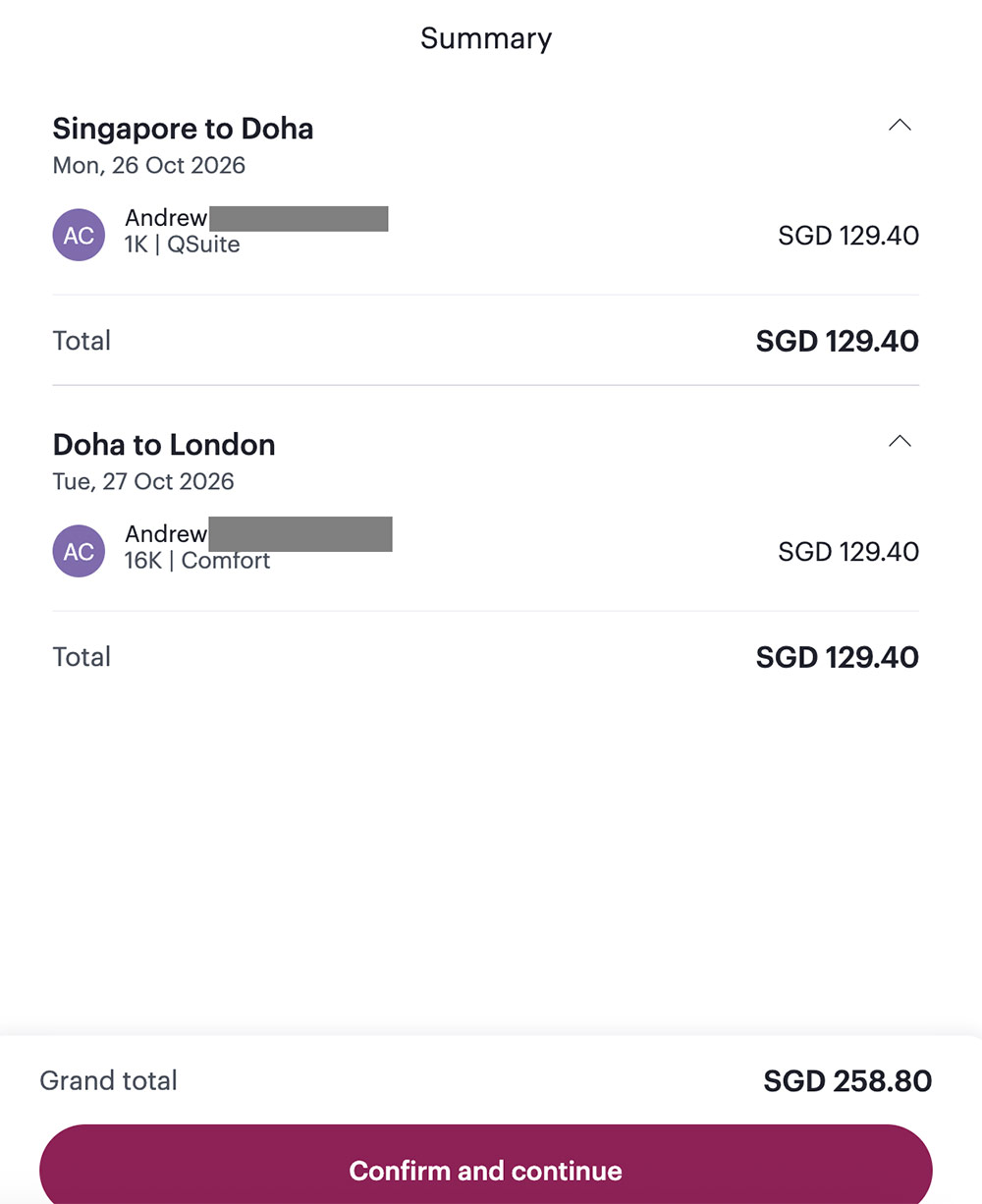 The per sector fee is particularly painful on multi-segment itineraries for multiple passengers, where costs would quickly spiral. On a return trip from Singapore to London via Doha, you’re looking at an additional S$518 just for the privilege of choosing your seat in advance – and that’s when travelling on your own!