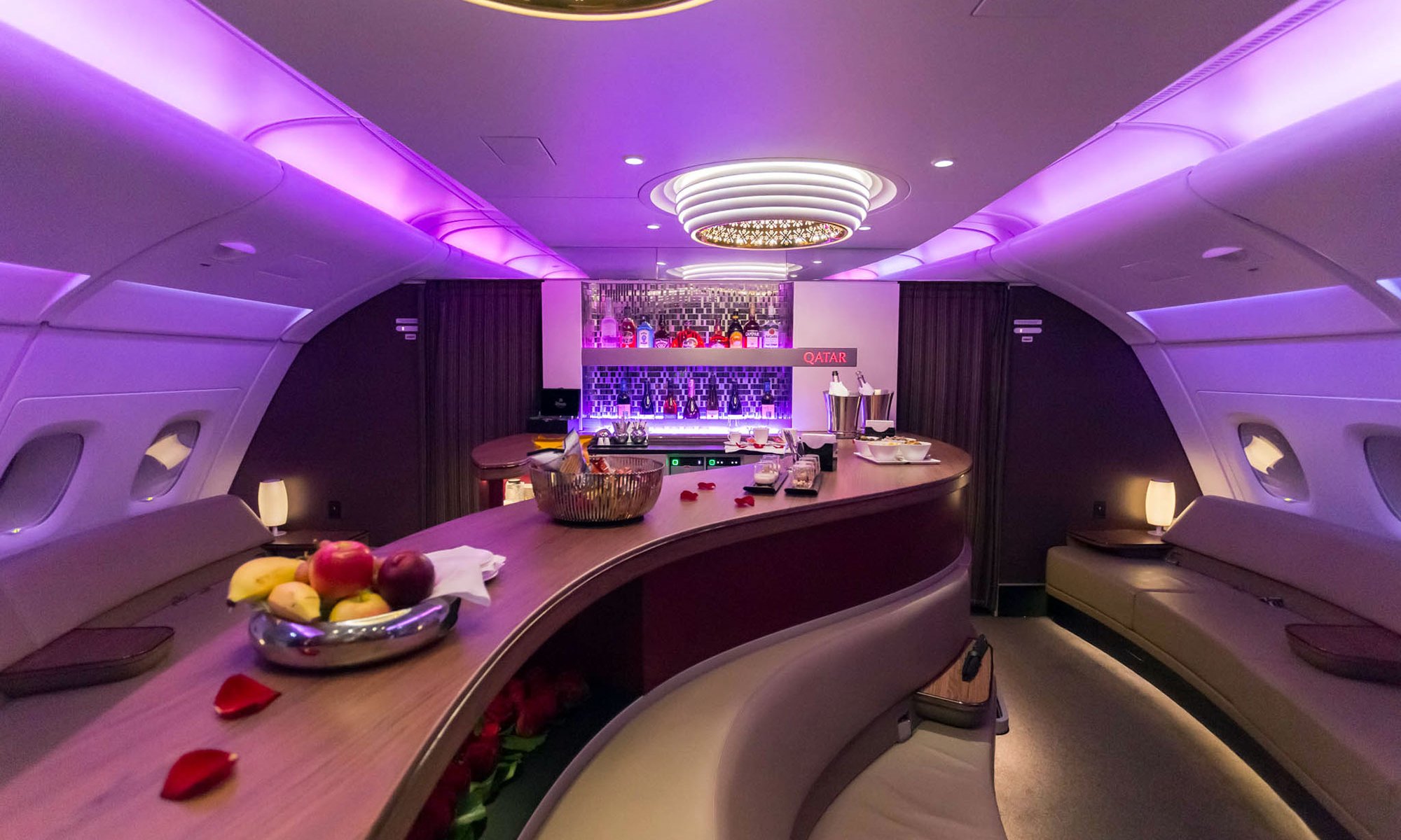 The upper deck bar remains one of the standout elements of Qatar’s A380 Business Class cabin, providing a social space for passengers to enjoy a drink and stretch their legs during the flight.