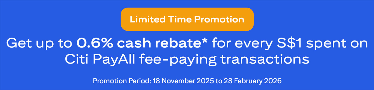 Between 18th November 2025 and 28th February 2026, Citi is offering eligible cardholders the option to earn 0.5% fee rebate on for up to S$150,000 spend using PayAll.