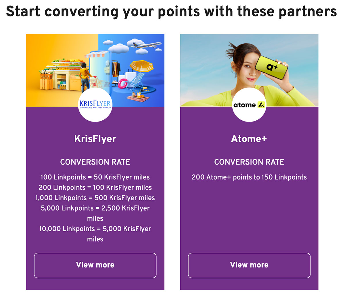 - LinkPoints points transfer to KrisFlyer miles (at a ratio of 2:1), and