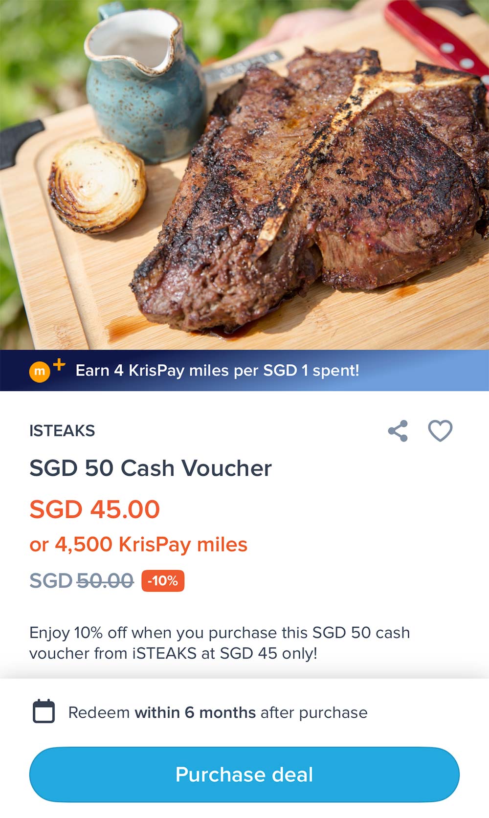 In the above example, you’ll earn 4 mpd (4 x S$45 = 180 miles) instantly when purchasing this iSteaks voucher.