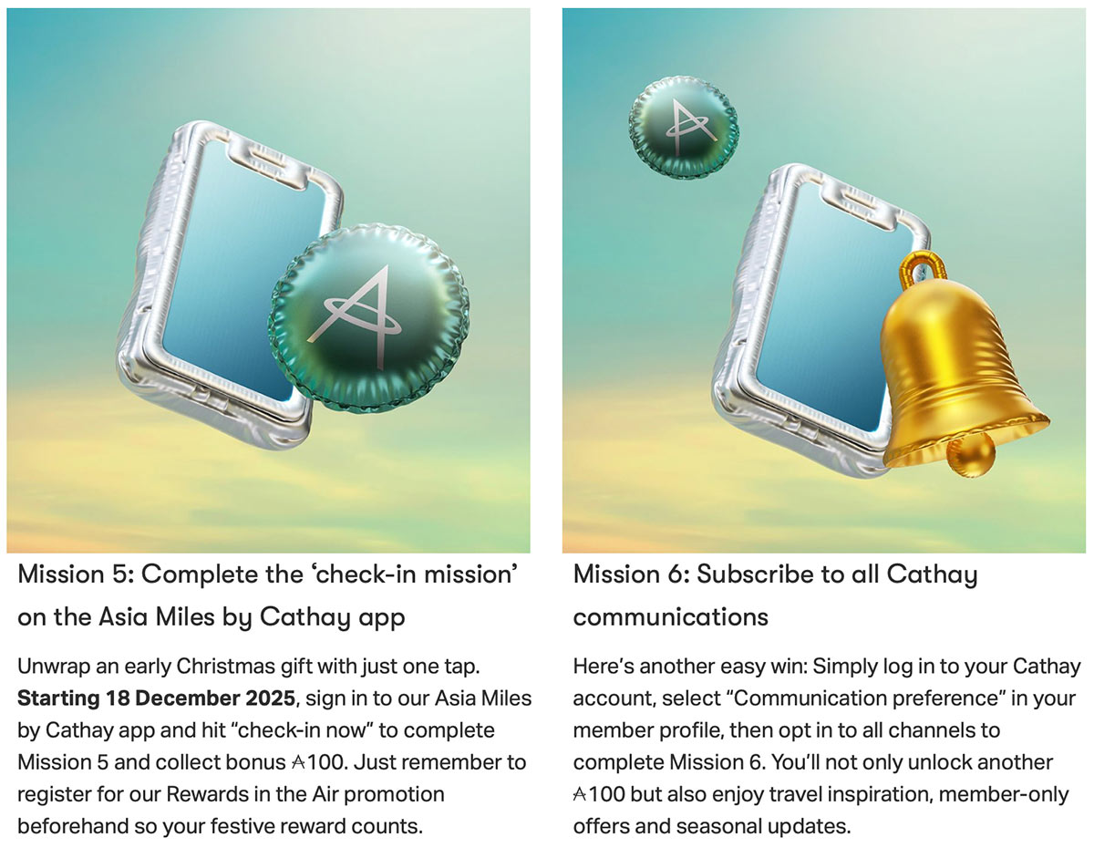 Cathay Pacific has launched “Rewards in the Air”, a festive promotion offering members up to 5,700 bonus Asia Miles for completing six missions by 31st January 2026. The good news is that you don’t have to commit to all six of these goals, just participate in as many or as few as you like.