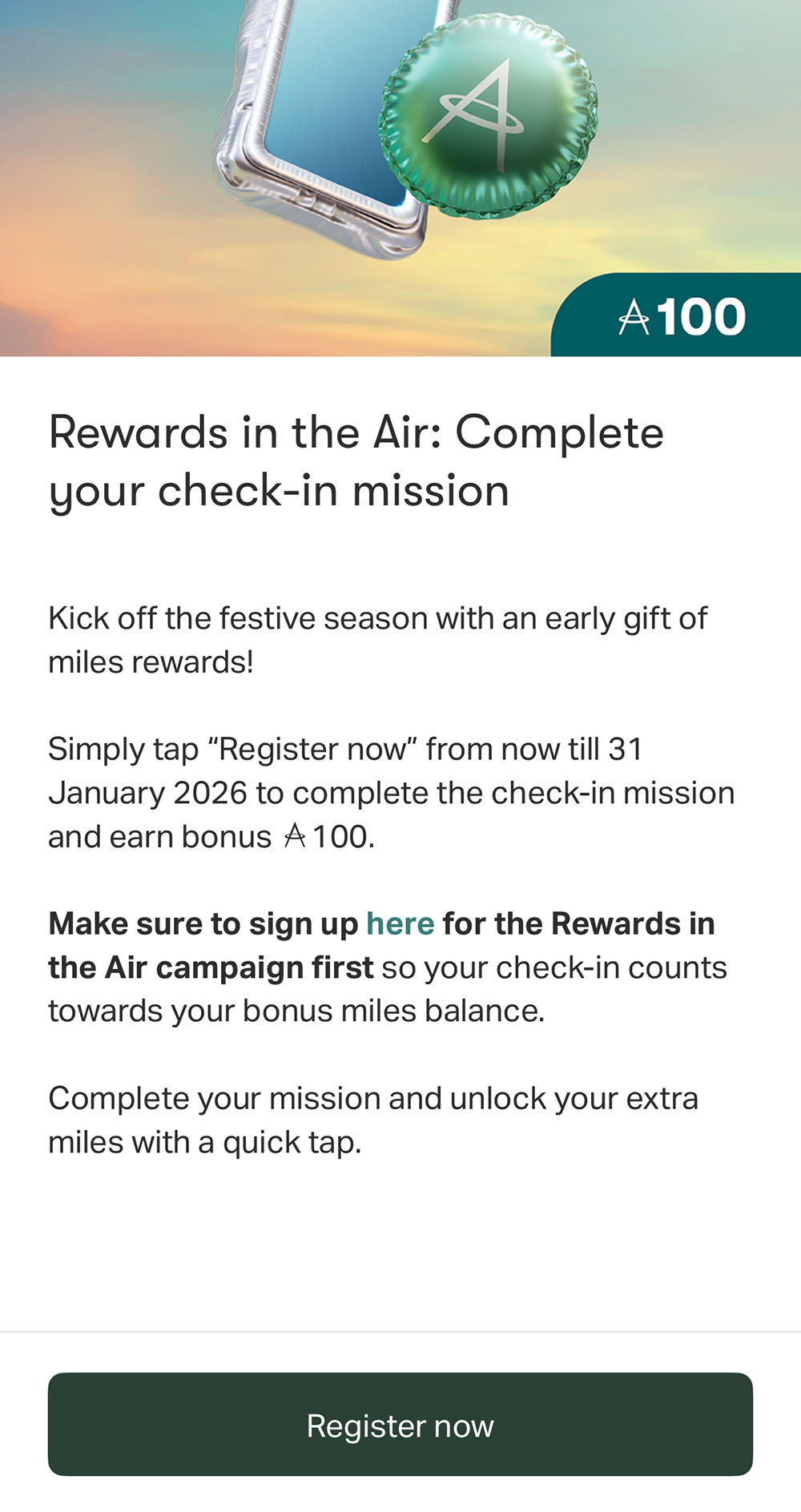 Mission 5 went live on 18th December 2025. Simply open the Asia Miles by Cathay app, sign in, and tap the “Register now” button to register for the promo.