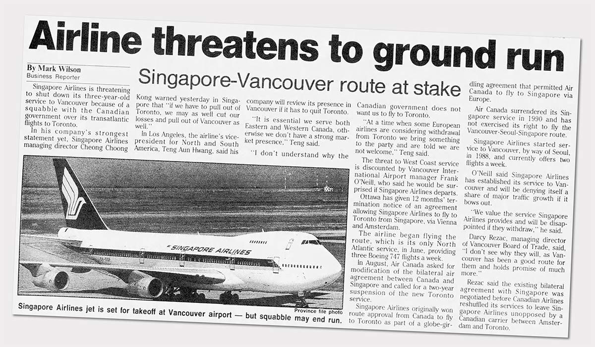 Other industry analysts saw it differently: Singapore Airlines had given in to Air Canada’s demands and written off the $20 million it had invested in the Toronto route, all to prevent Canada from tearing up the bilateral agreement entirely and killing the Vancouver service too.