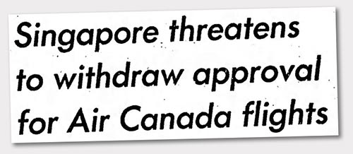 “On Thursday night, the talks broke down and it seemed as if Air Canada might have to say goodbye to Singapore in July. According to a Canadian delegate, the Canadian High Commission and Air Canada prepared to hold a press conference to announce this.”