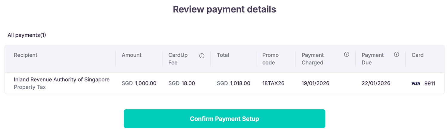 CardUp is offering new and existing customers using local Visa cards a discounted fee of 1.8% when making both one-time and recurring IRAS property tax payments, one-time IRAS stamp duty payments, and recurring income tax payments, between now and late March 2026.