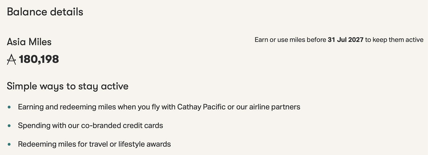 Unlike KrisFlyer’s fixed three-year expiry from the month of earning, Asia Miles operates on an activity-based expiry system. Any earning or redemption activity, no matter how small, resets your entire balance for another 18 months.