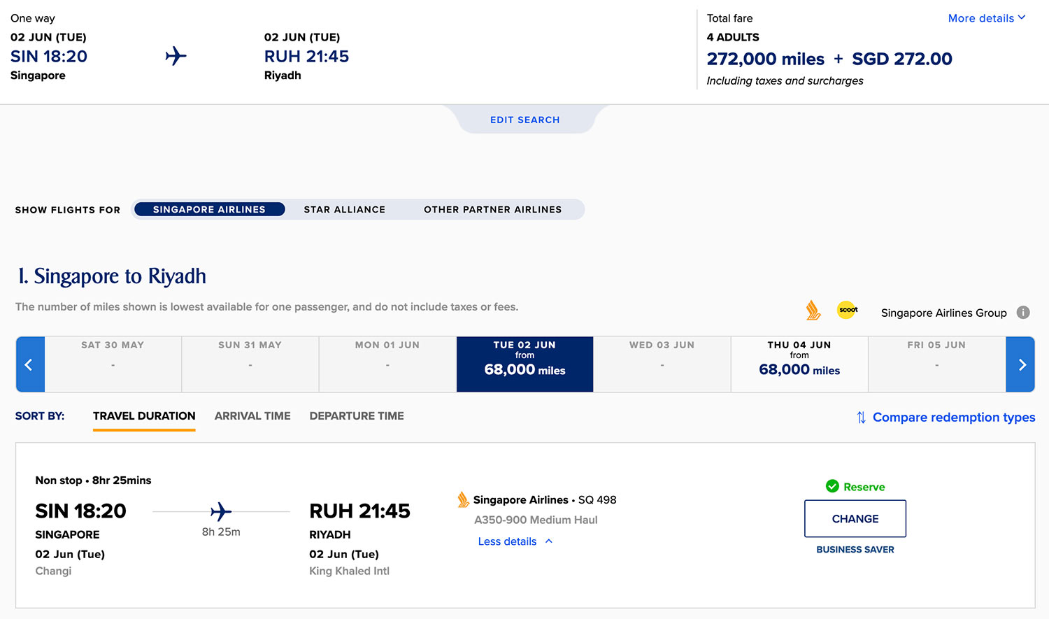 Note that redemptions made on or after 1st April 2026, for travel on or after 1st October 2026, will also be hit with Singapore’s new SAF tax on this route – an extra S$25.60 in Business Class and S$6.40 in Economy Class in the Singapore – Riyadh direction – so try to redeem future-dated flights before then if you can.