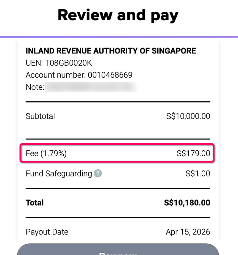 Once applied, you will see the fee drop from 2.4% to 1.79% (Visa) or 1.99% (Mastercard). In the following example, an income tax payment of S$10,000 using a Visa card now carries a fee of S$179 (1.9%) instead of S$240 (2.4%).