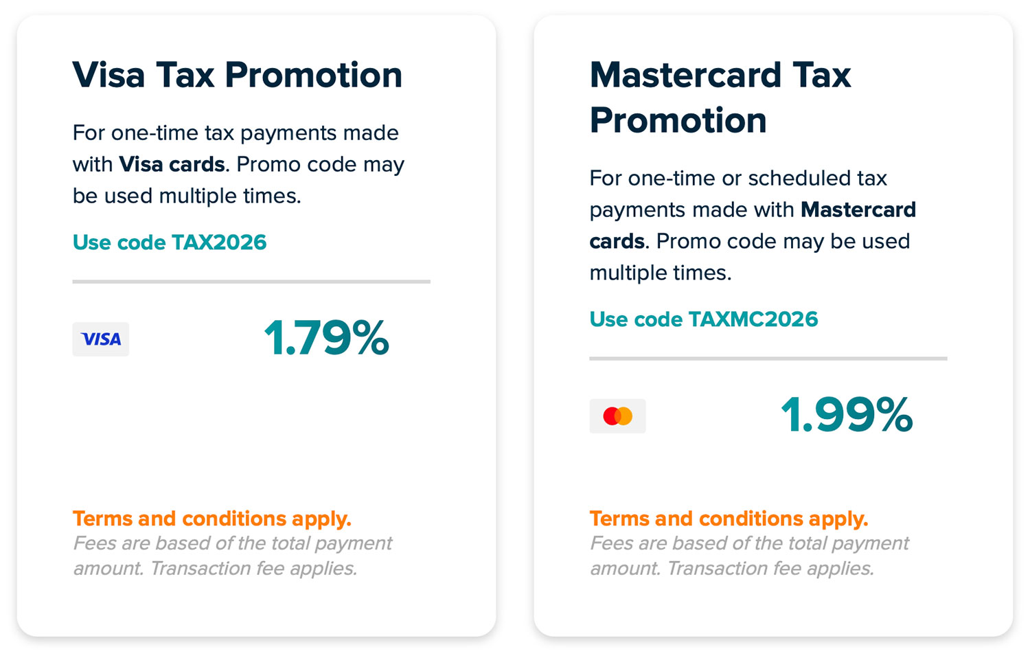 Here’s where you’ll enter the TAX2026 or TAXMC2026 promo code, as appropriate depending non the card network issuer (Visa or Mastercard),