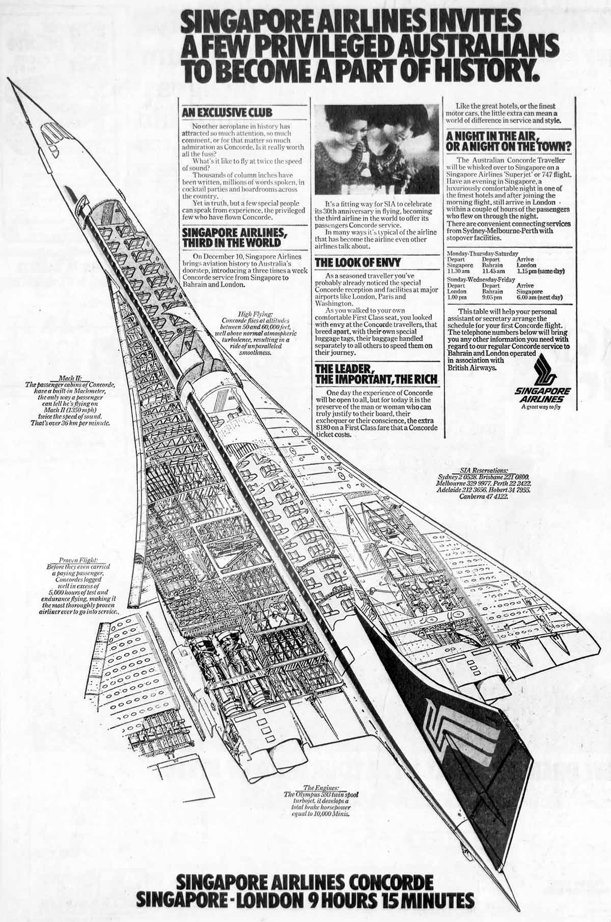For its part, British Airways pushed out its own Concorde service advertising in the UK press. A full-page spread led with the punning headline “The Not-So-Far East”, promising travellers a 9.5-hour journey to Singapore, five hours and 20 minutes faster than the quickest subsonic alternative, with arrival fresh enough for morning connections onwards into South East Asia.