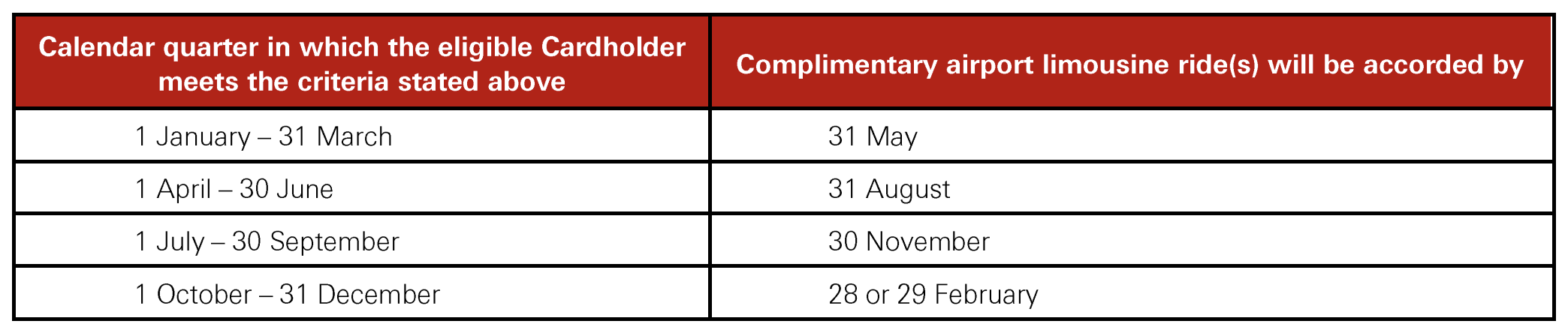 Cardholders are awarded a complimentary airport limousine transfer to or from Changi Airport once per quarter, provided they spend at least S$12,000 on the card in that quarter. For new cardholders, the requirement is halved to S$6,000 in the calendar quarter of approval.