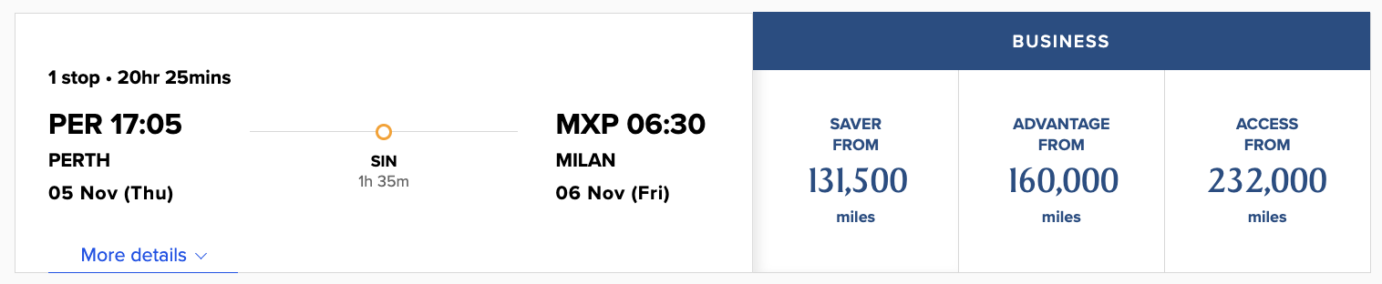 For Zone 8 to Zone 11 in this case (Perth to Europe), it’s 131,500 miles each way for a Saver Business Class award, not 151,000 miles (42,500 PER-SIN + 108,500 SIN-MXP).
